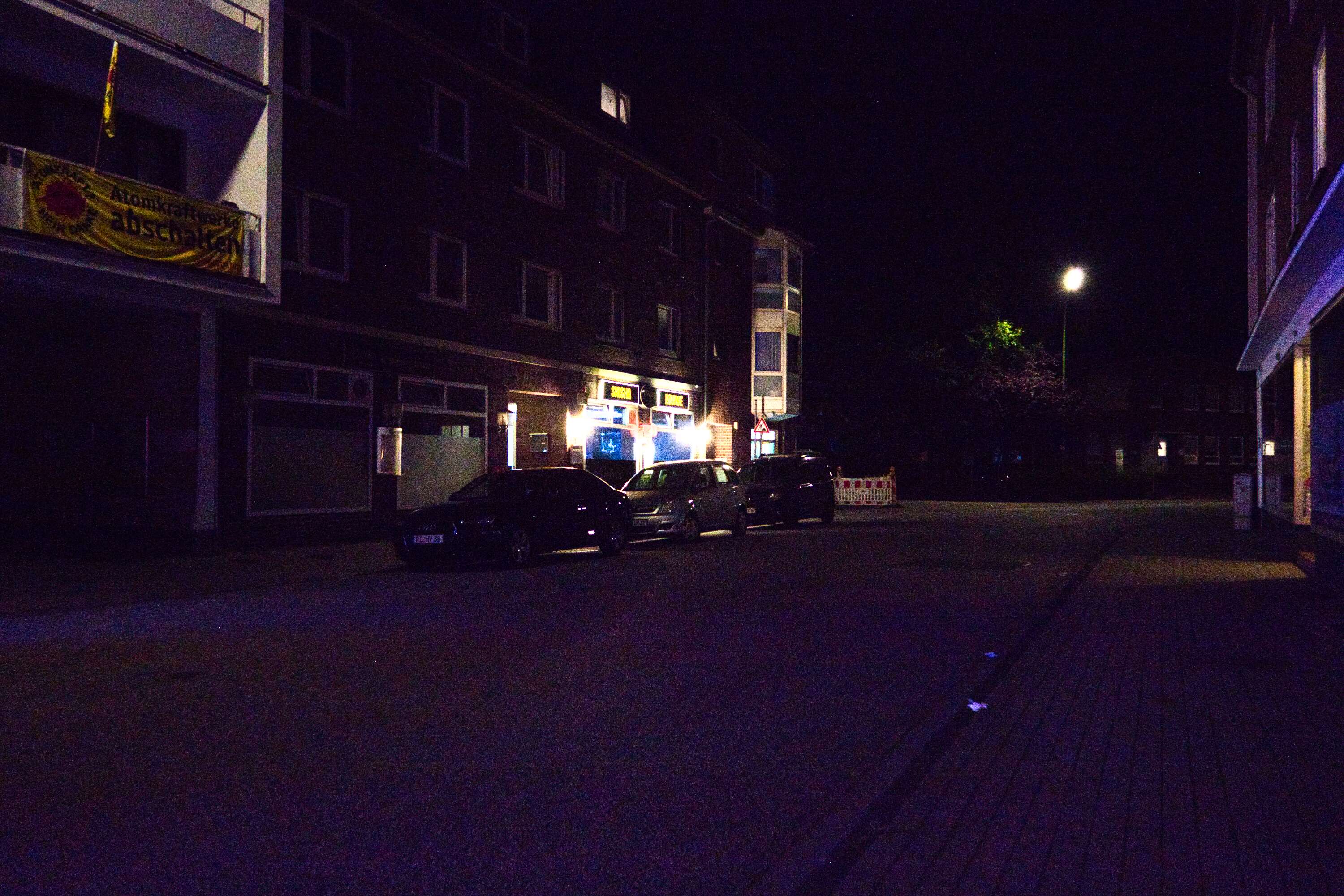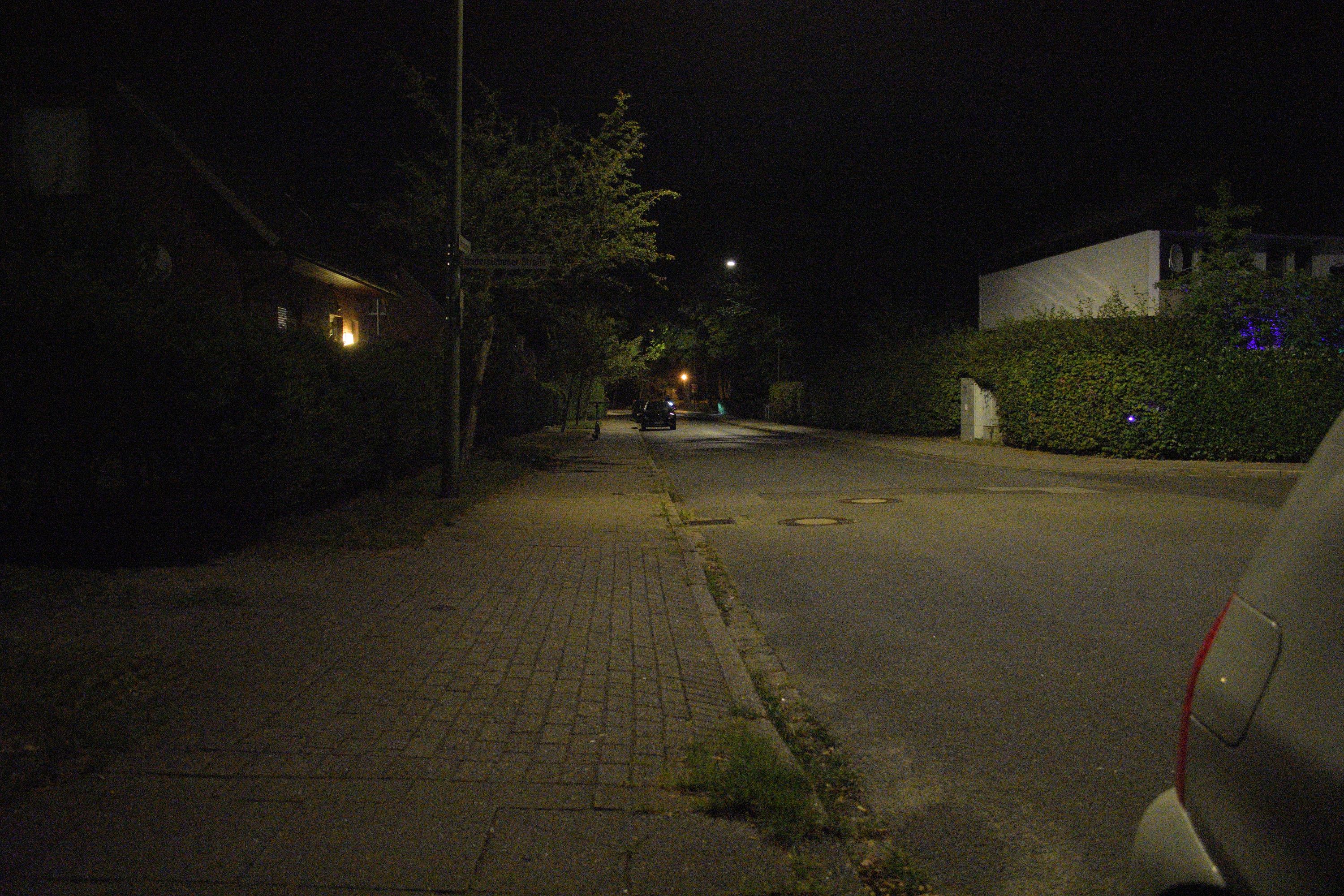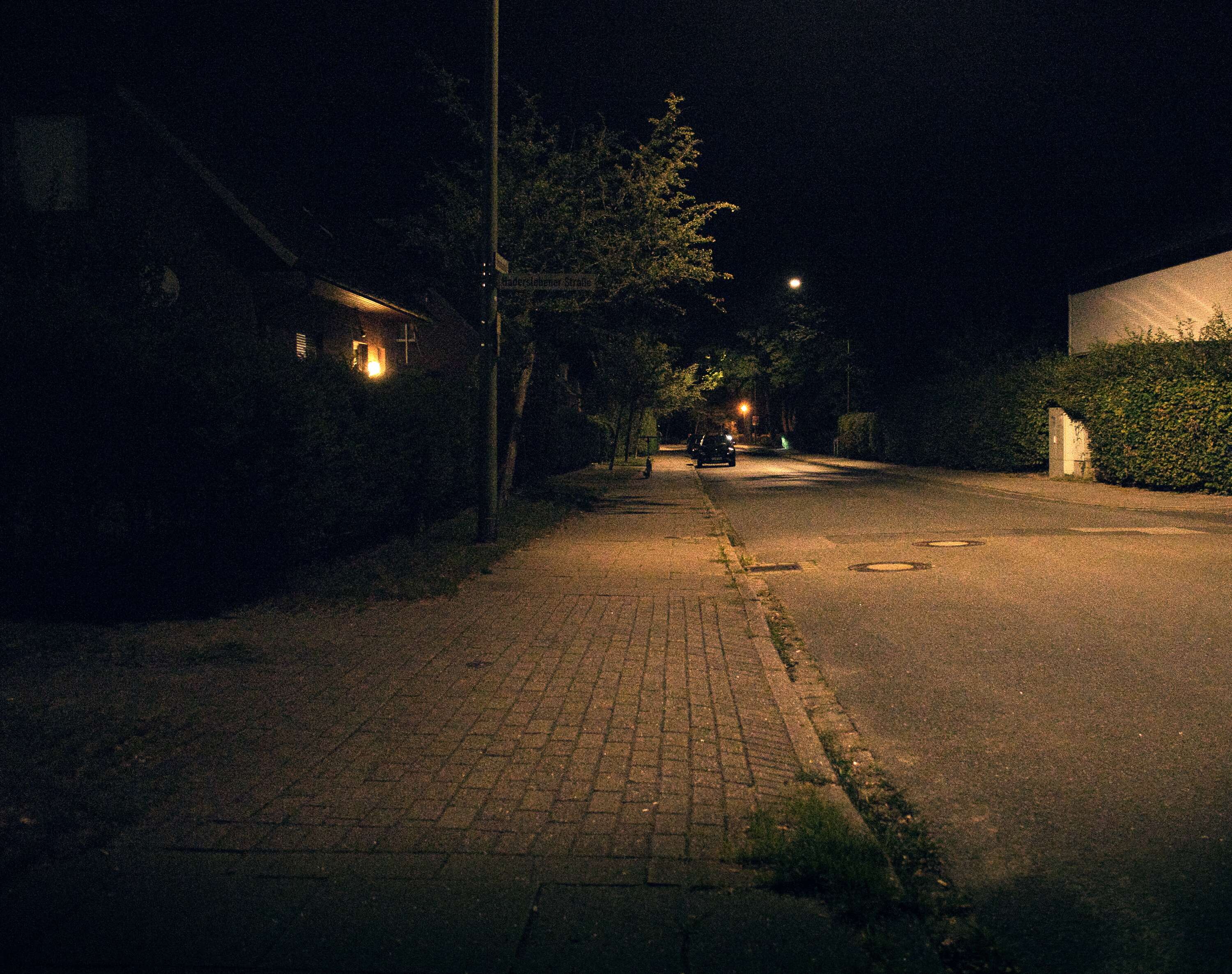 Ein ruhiges Wohngebiet am Stadtrand. Hier gibt es viel Grün, Bäume, Sträucher, Rasen. Und nachts ist man meist allein.