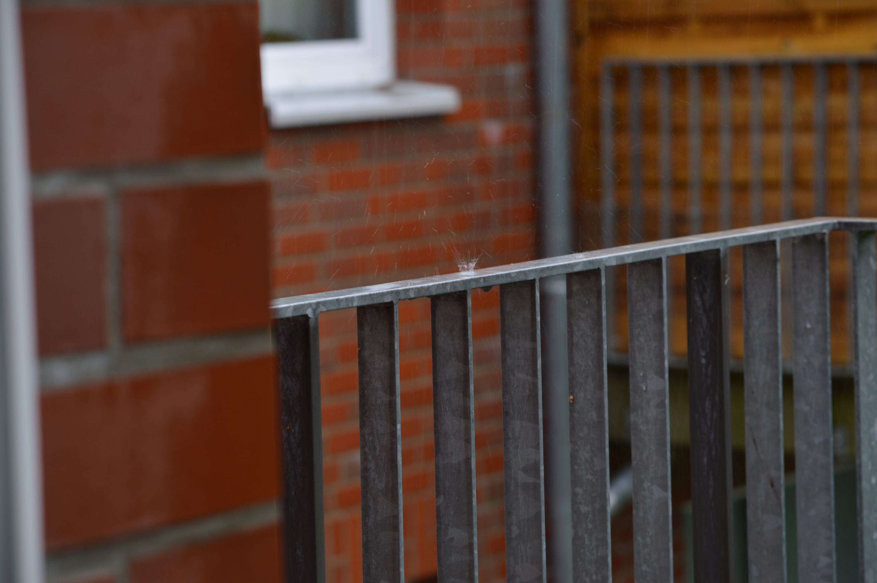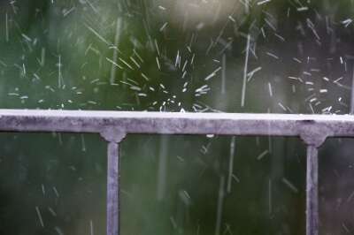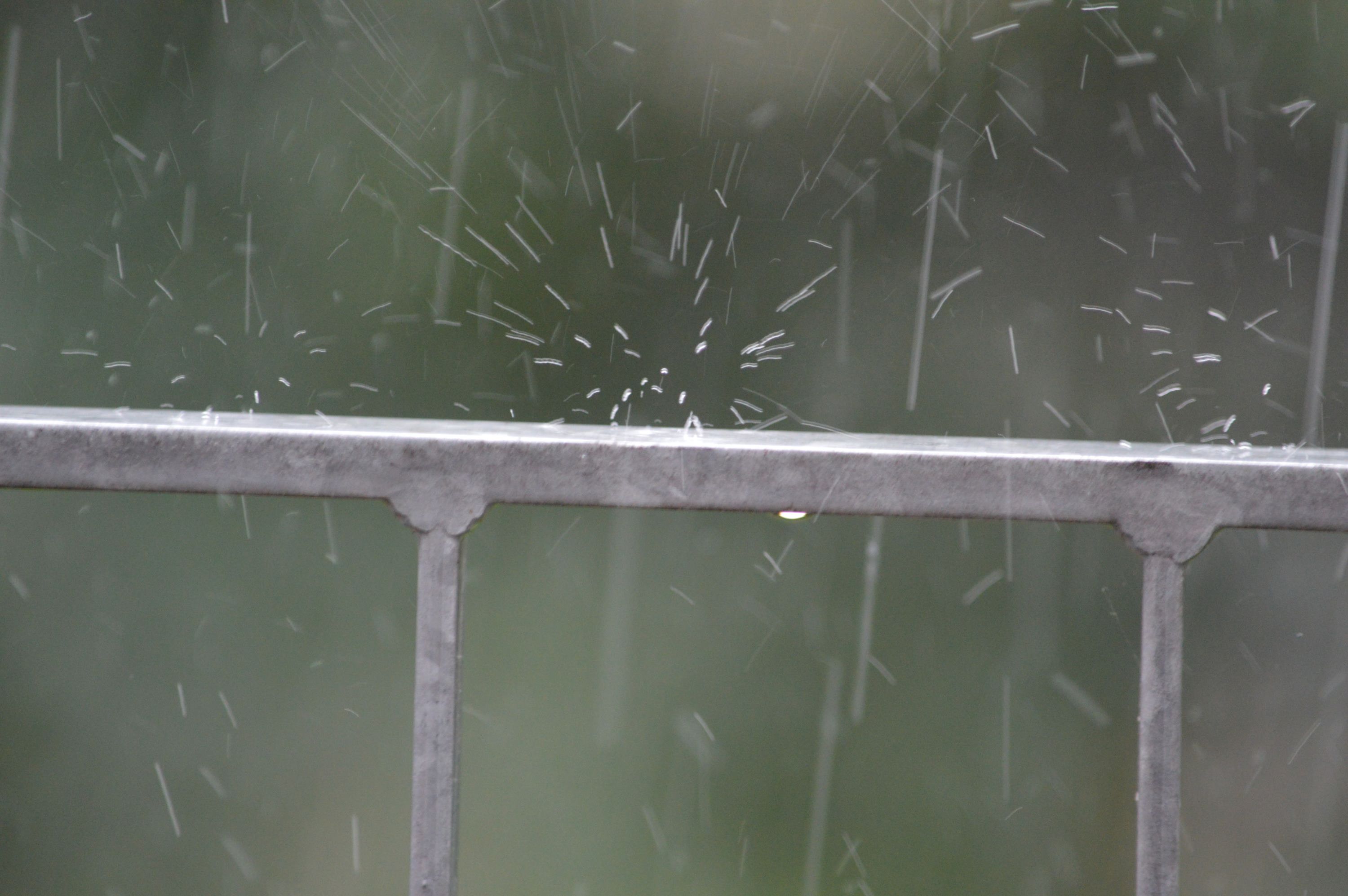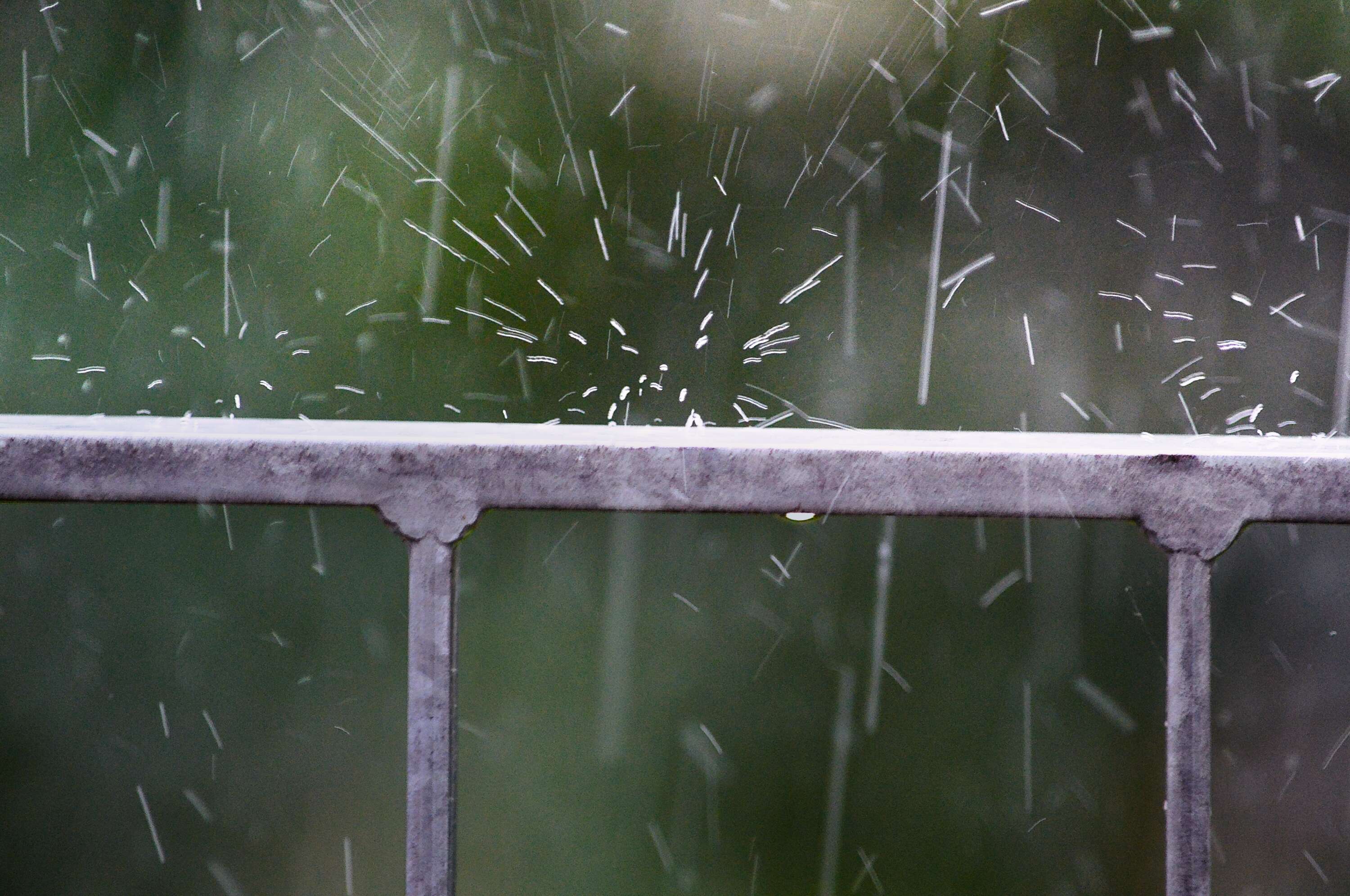 Die Regentropfen prallen so schnell ab, dass sie trotz der kurzen Verschlusszeit wie Fäden wirken.