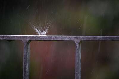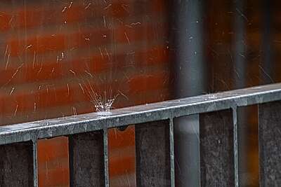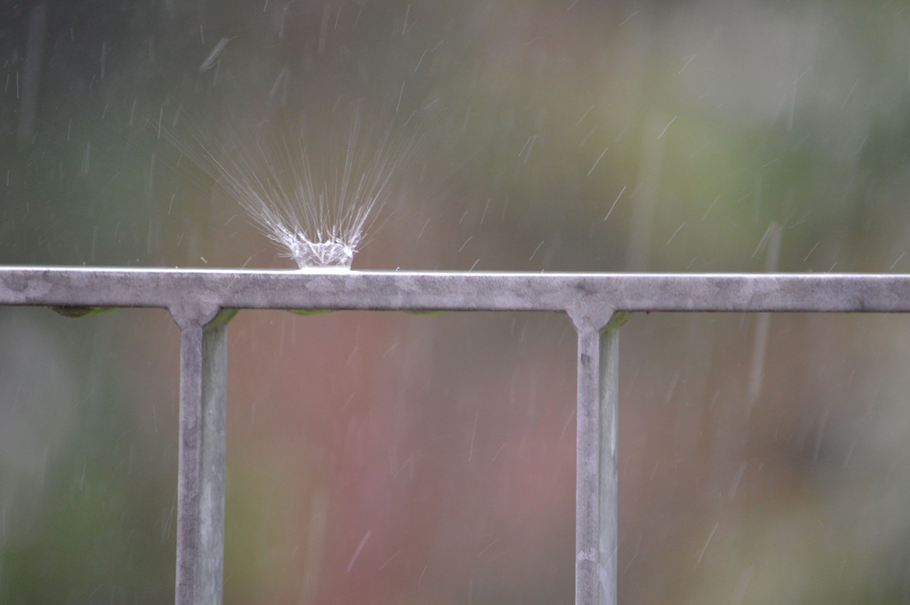 Ein kräftiger Regen und ein Tropfen fällt mit hoher Geschwindigkeit auf das Geländer und zerplatzt in alle Richtungen.